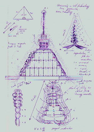 My panic soon eased, however and curiosity won the day. I eagerly scanned the viewer for my first close look at the alien landscape. What I could see was an area of level ground, similar to a courtyard, leading to two pyramid shaped buildings. They appeared to be made from a material that looked just like tinted glass or semi-transparent plastic. I couldn’t quite see the apex of these buildings from my vantage point, but later I was to find that they were capped with a spiral tower or antenna arrangement. The height of the tower added approximately twenty five present to the buildings overall height. Each building in turn was topped with what I can only describe as a large light bulb. As peculiar as it may sound, I was sure I had seen something like this before, in the distant past. These bulbs glowed day and night, and upon closer inspection appeared to be of a net or mesh construction rather than being glass spheres.